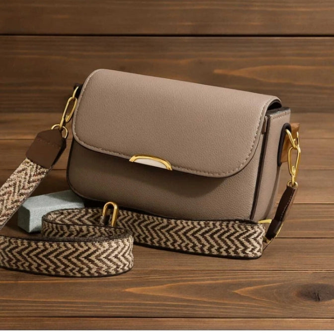 A compact and stylish crossbody bag designed for everyday use. Crafted in a smooth taupe faux-leather finish, it features a structured rectangular shape with a clean flap front and a subtle gold-tone accent. The bag is paired with a wide, detachable strap in a beige and brown chevron pattern, adding…